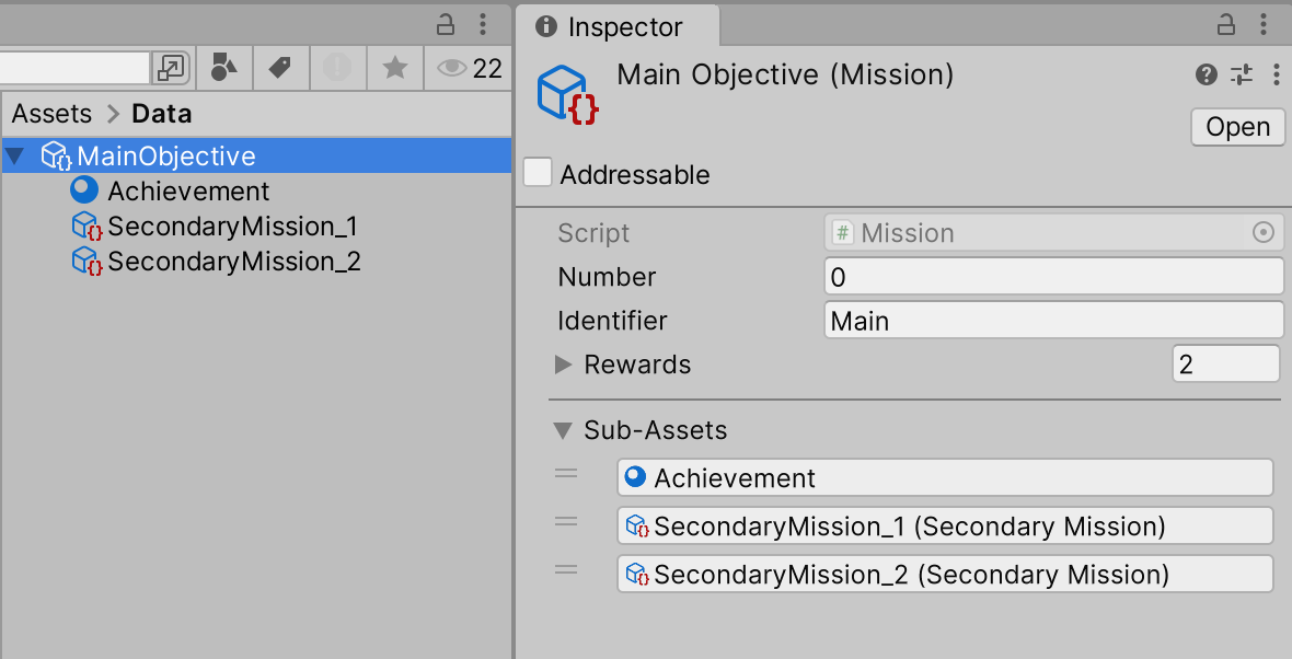 <figure><img src="https://3475550444-files.gitbook.io/~/files/v0/b/gitbook-x-prod.appspot.com/o/spaces%2FWP70ItOegbJjXGyNP2E7%2Fuploads%2FgnLDIxJv9994AoYcVWK4%2FSubAssetAwareObject.png?alt=media&#x26;token=c4024690-1763-44e8-8ae1-d9ebefec1e1f" alt=""><figcaption><p>The MainObjective SO contains 3 sub-assets,<br>which are visualised at the end of its Inspector</p></figcaption></figure>